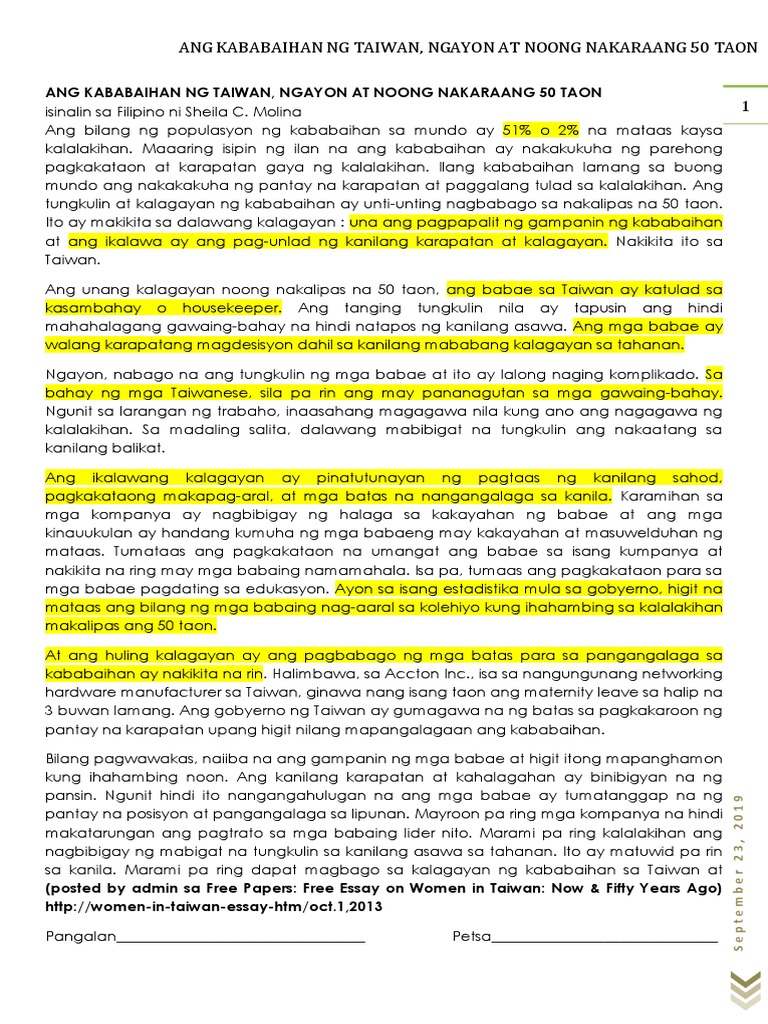 Ang kababaihan ng taiwan grade 9 filipino 1. Ngayon at noong nakalipas na 50 taon ang unang kalagayan noong nakalipas na 50 taon ang babae sa taiwan ay katulad sa kasambahay o housekeeper. Molina Ang unang kalagayan noong nakalipas na 50 taon ang babae sa Taiwan ay katulad ng kasambahay o housekeeper.