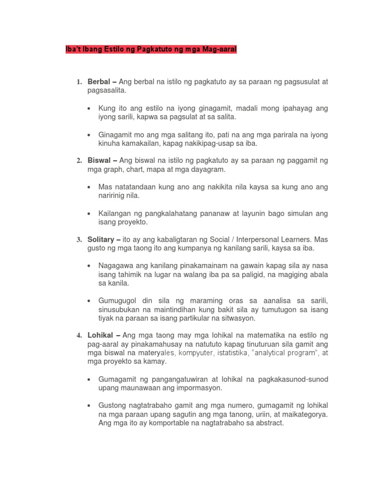 Dahil dito ang paraan ng pagtuturo ay dapat na akma at bumabagay sa bawat mag-aaral at sa istilo ng kanilang pagkatuto. Pagkakasunod-sunod ayon sa ranggo. Scribd est le plus grand site social de lecture et publication au monde.
