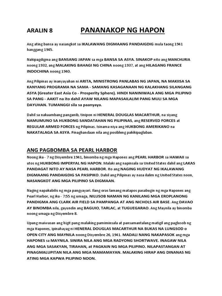O2z1qpv and 227 more users found this answer helpful. ARALING PANLIPUNAN I Effective and Alternative Secondary Education MODYUL 15 PANANAKOP NG HAPON AT REAKSYON NG MGA PILIPINO BUREAU OF SECONDARY EDUCATION Department of Education DepEd Complex Meralco Avenue Pasig City. Sinalakay ng Hapones ang PearlHarbor5.