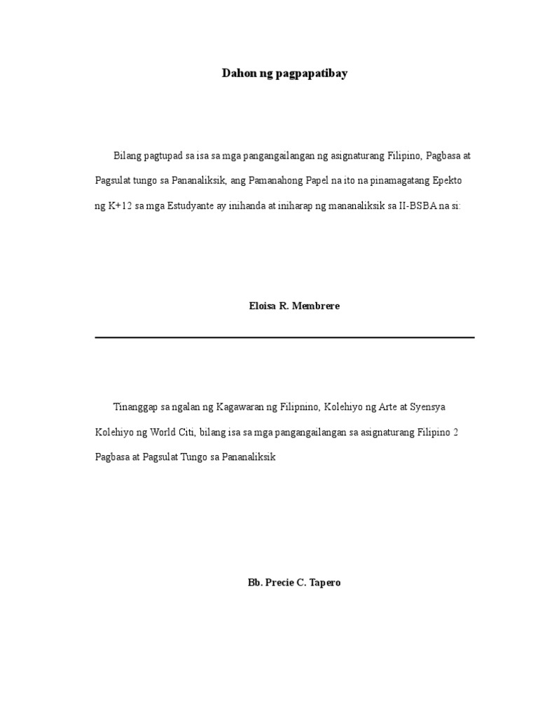 Katulad ng iba pang wikang buhay ang Filipino ay dumaraan sa proseso ng paglinang sa pamamagitan ng panghihiram sa mga wika ng Pilipinas at mga di katutubong wika sa ebolusyon ng ibat ibang varayti ng wika para sa ibat ibang sitwasyon sa mga nagsasalita nito na may ibat ibang saligang sosyal at para sa mga paksa ng talakayan at. TUTULAN ANG 12 YEAR BASIC EDUCATION K to 12 CURRICULUM NG REHIMENG US-AQUINO Bago pa man maupo sa pwesto talagang itinutulak na ni Pres. 2 on a question Magpahayag ng dalawang kaisipan mula sa binasa patungkol sa pagiging mahabagin at mapagbigay.