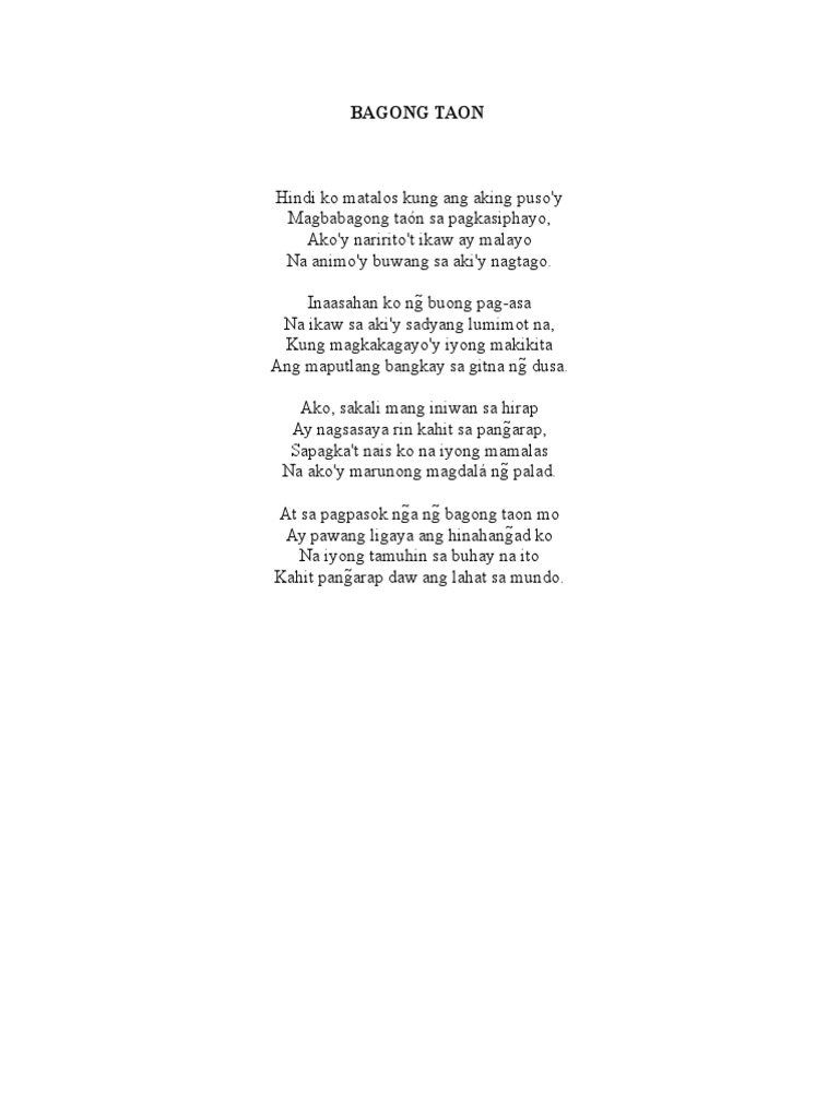 Bagong taonbagong simula ng aking buhay Bagong buhay kasabay ng pagsikat ng araw Bagong pag-ibig sanay dumating puro at tunay Bagong. JAYCEE ZIV Natapos na naman ang isang makasaysayang taon Karanasang dumaay pahina na lamang ng panahon Mga ala-alay kasamang lumipas ng isang kahapon Wari bang isang muling hakbang sa dako pa roon. Ito ang pinakamainam na panahon para planuhin ang ating buhay anupat ito ay pumapagitan sa nakaraan taong hinarap at bagong taong haharapin.