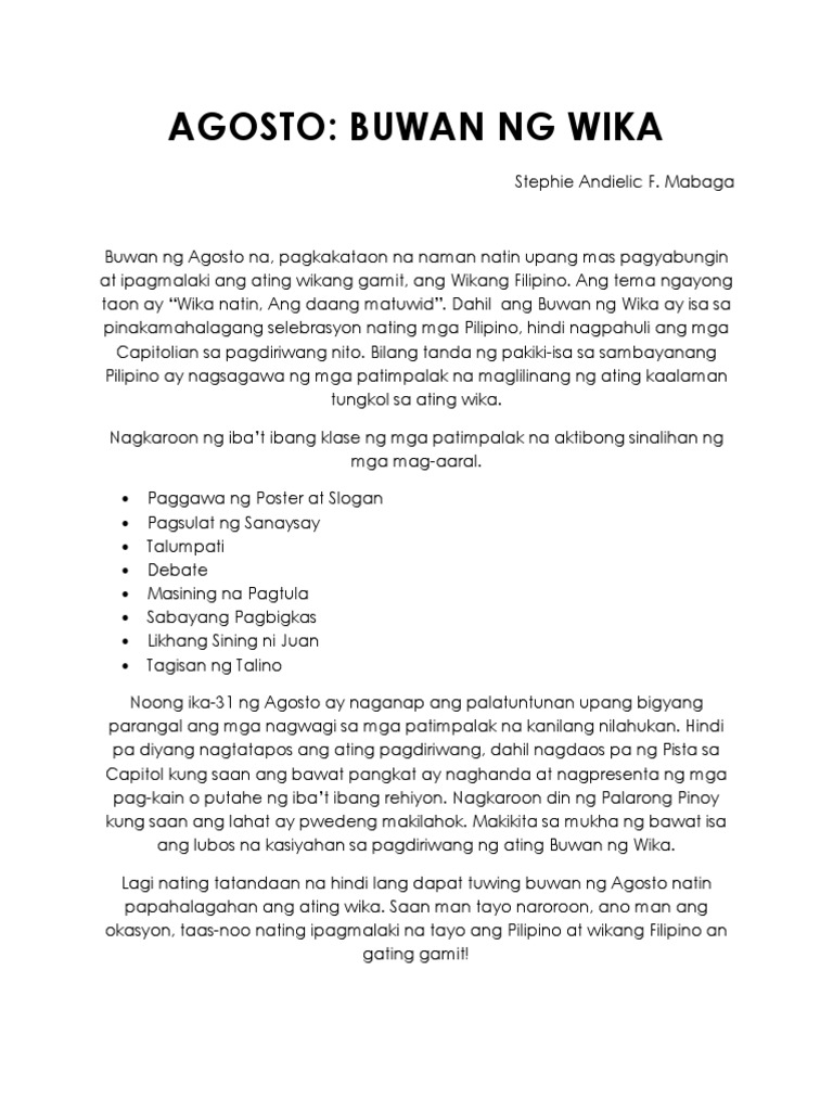 Heto ang halimbawa ng maikling Sanaysay. Filipino 28102019 1629. 10-14 Agosto 2020 Katutubong Wika.