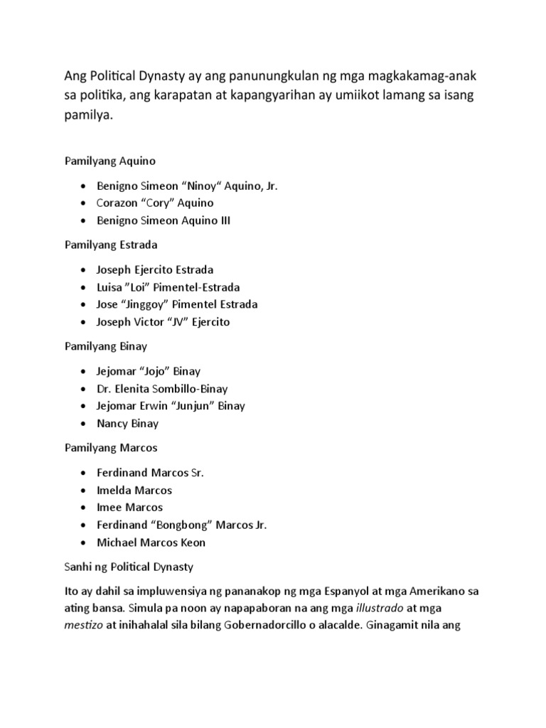 View AP_PRESENTATIONpptx from AA 1Dynasties Impluwensiya ng mga Espanyol at Amerikano Political Dynasty Ayon sa Saligang Batas 1987 Ang Political Dynasty ay tumutukoy sa panunungkulan ng. Ang pagbabawal sa political dynasty ayon sa saligang batas 1987artikulo II seksiyon 26 ng 1987 saligang batas ng republika ng pilipinAS.