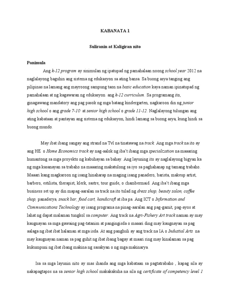 Ang pagsisimula nito ay nangangahulugang ipatutupad na ang bagong curriculum para sa grade 1 curriculum lamang kindergarten at grade 7 o first year high school lamang. Unti-unting ipapatupad ang Kto12 curriculum hanggang sa makagraduate ang unang batch ng senior high school sa School Year 2017-2018. 40 sesyon bawat markahan apat na araw sa loob ng isang linggo K to 12 Senior High School Applied Subject Filipino sa Piling Larang Akademik Disyembre 2013 Pahina 1 ng 5 Titulo ng Kurso.