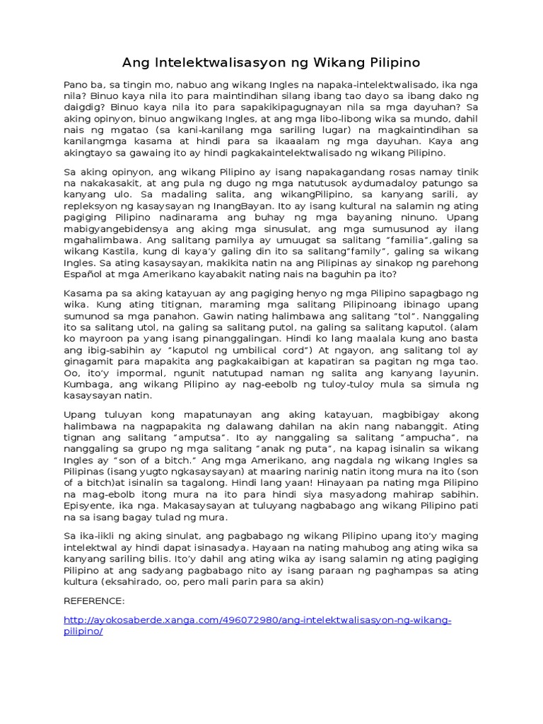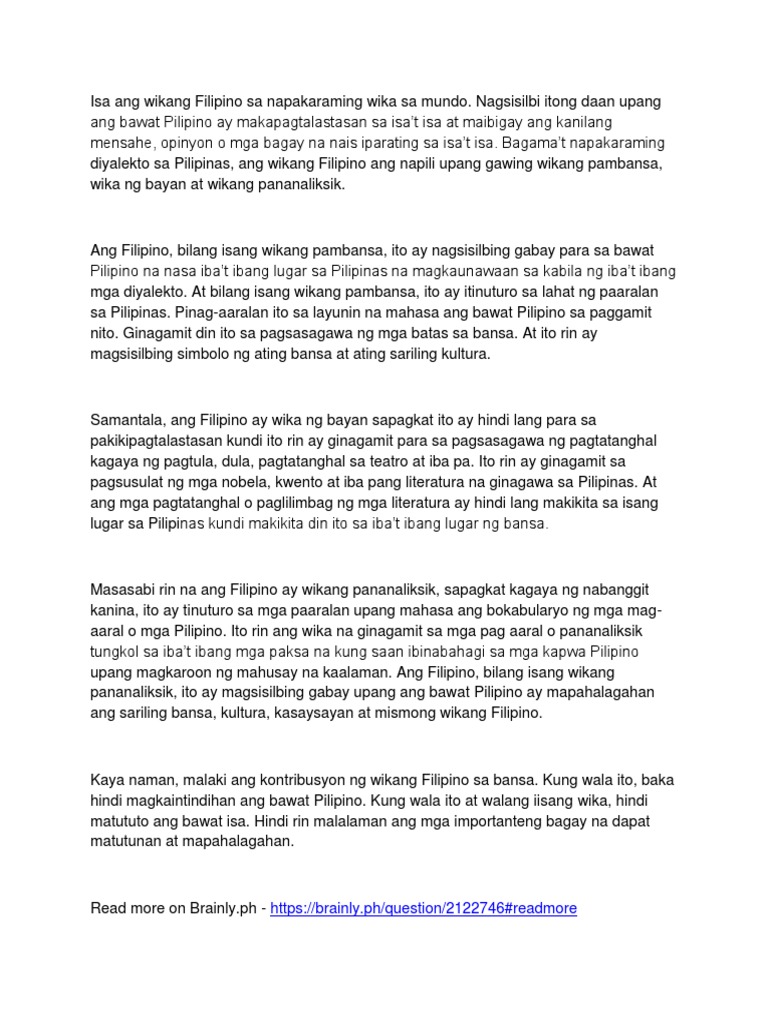 Ilang taon pinaglaban ng ating mga ninuno ang wikang filipino. Isang arkipelago ang Filipinas kung kaya nagkaroon ito ng maraming katutubong wika. Ang alon na binubuo ng pangalan ng mga wikang umiiral sa kapuluan ay paalala na iisa lámang ang pinagmulan ng mga wika sa bansa. Sa aminin natin o hindi mas ang nadama nating kasiyahan sapagkat wikang sarili ang kanilang ginamit at kay tamis pakinggan ng sariling wikang namutawi sa kanilang bibig.